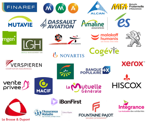 Nous avons formé en communication écrite les collaborateurs de : Electricité de Strasbourg ; Amaline ; Maaf ; Macifilia ; Verspieren ; Mutavie ; MMA ; MGEN ; Cogévie ; Humanis Malakoff ; MFA ; La Mutuelle Générale ; Banques Populaires ; Groupama ; Finaref ; LGH (Le groupe de l'hôtellerie) ; Intermarché, etc.